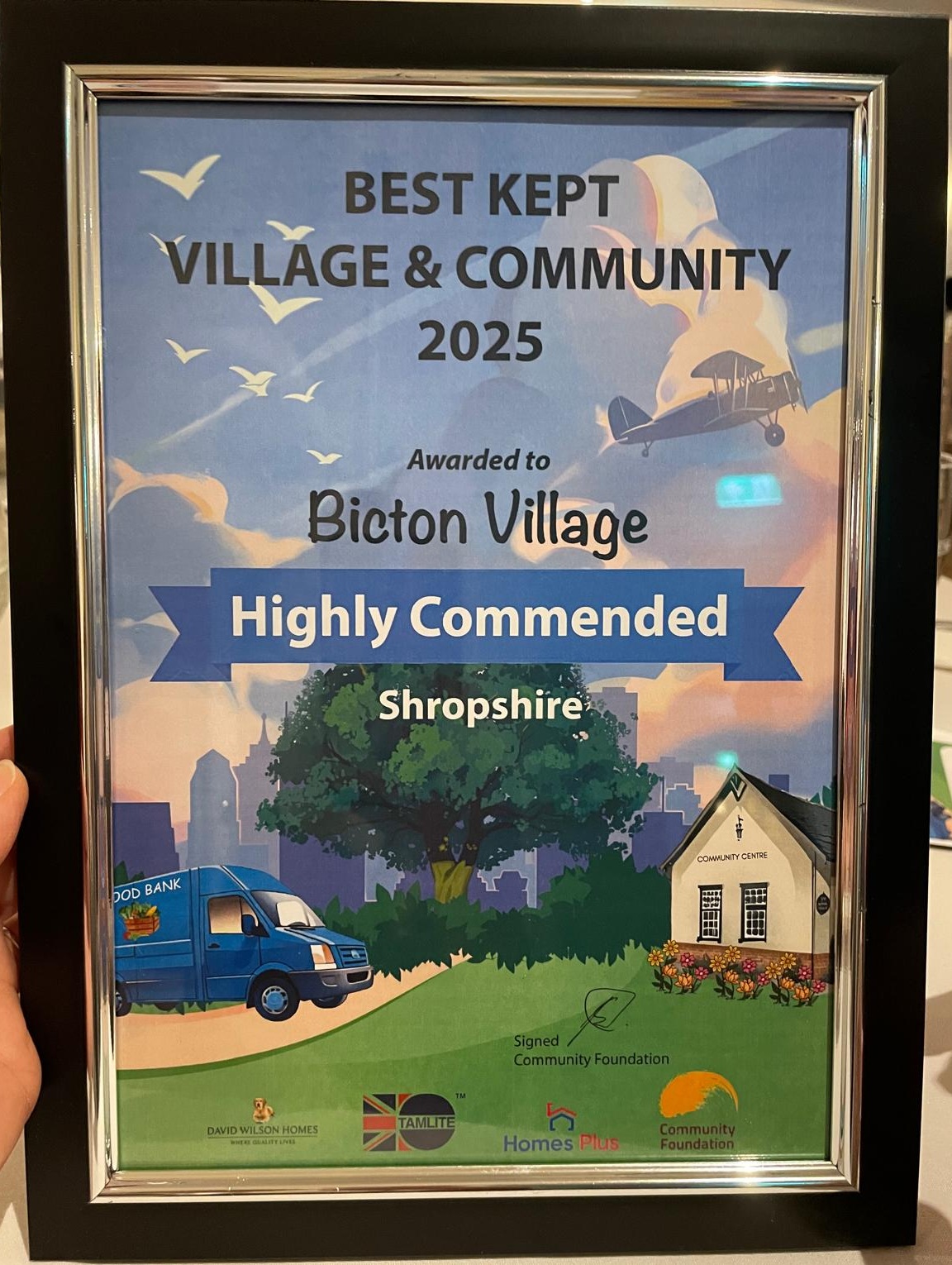 In 2025, some 939 years after the Domesday Book, Bicton entered the ‘Best Kept Village Competition’ and was rewarded with a ‘Highly Commended‘ Certificate. Congratulations are due to all involved with the project.